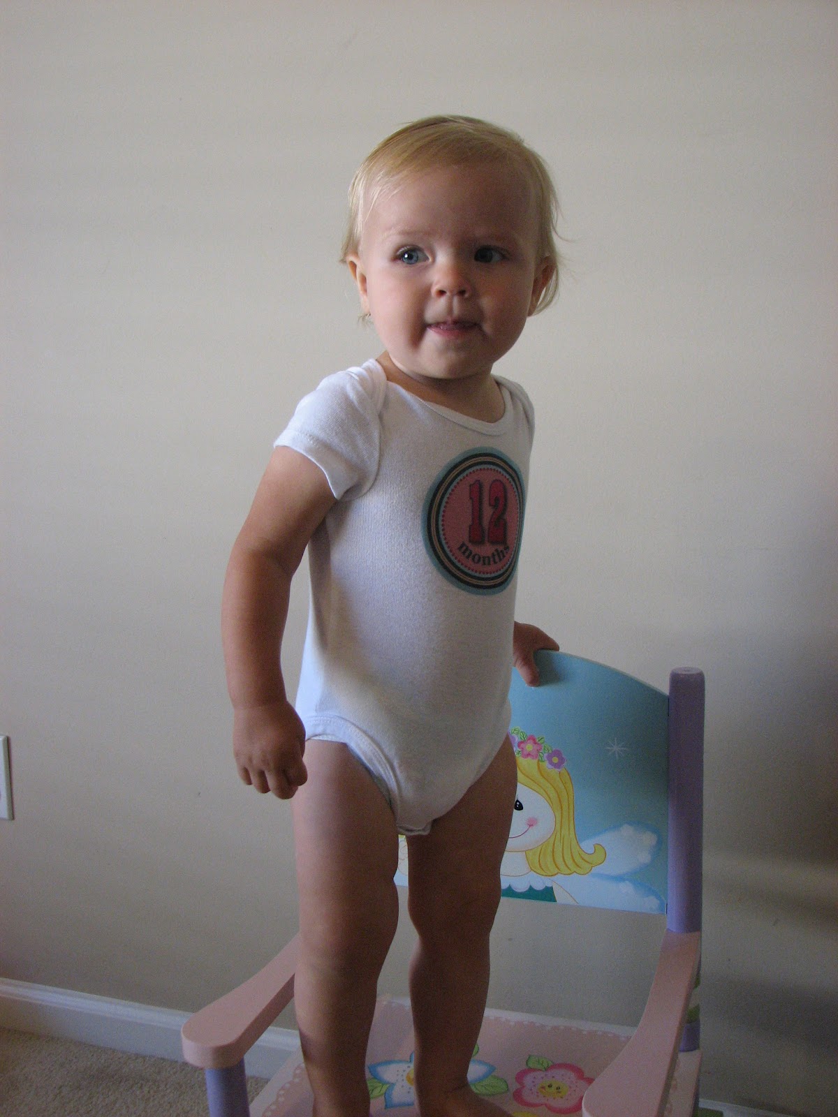 Favorites at one year: Being outside, exploring anything and everything, watching the ducks, petting Kitty, waving, smiling, eating banana muffins, snacking on cookies and cheesy puffs, taking baths with Mommy, getting chased by Daddy, climbing and standing on dangerous objects, hanging out with Gabriel and playing with his big boy toys, the Backyardigans, going to the park with Daddy, and being a lovey dovey to all her favorites!
